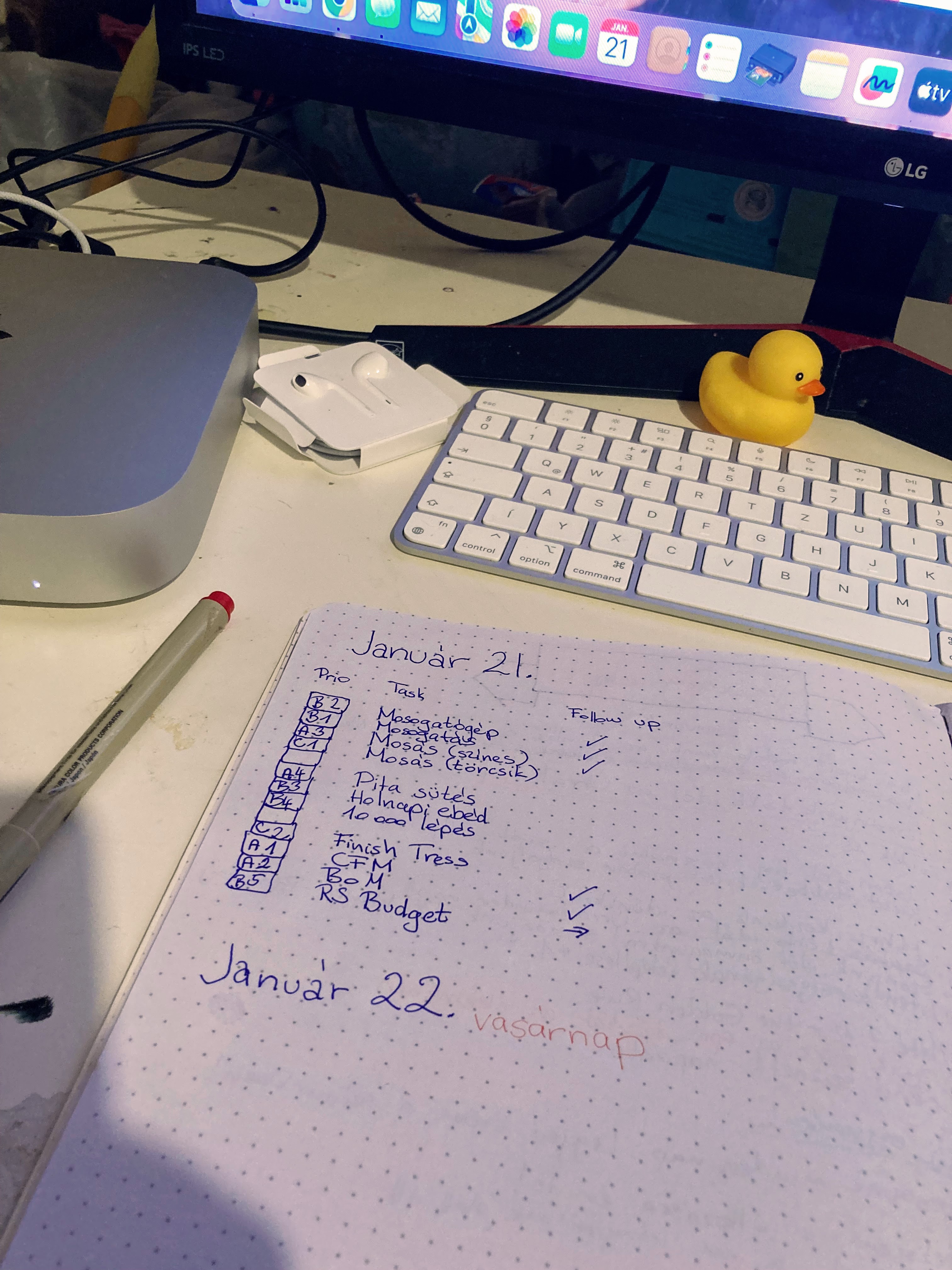 So what makes my planning different? I do two things. As I mentioned before, I don’t make year-long resolutions, but shorter ones that can contribute towards a bigger, long term goal that might or might not fit a calendar year. Some of it is aimed at developing good habits, some are things I want to try for fun, some are there to really just track how I’m doing. So for every month or week page I have a list of these, a tracker for them with my own marking system, and a weekly evaluation. Some pages also have art from Elder Harman of a duck that has skipped leg days. I mean he is a brilliant artist, why wouldn’t I want his art randomly in my journal?