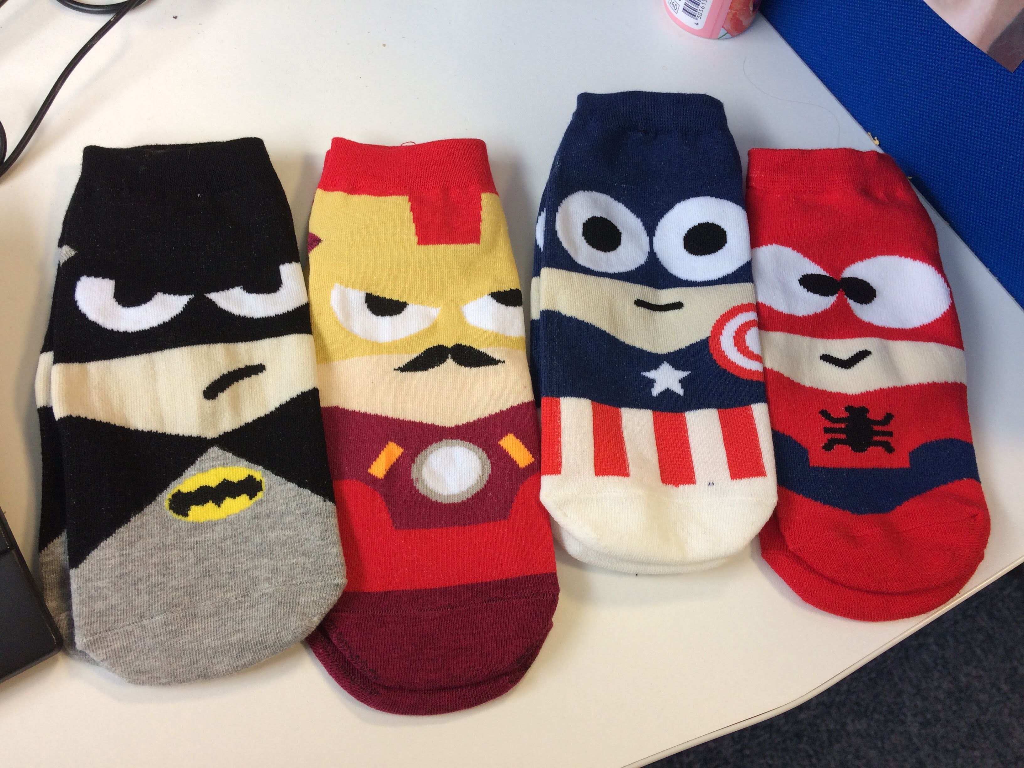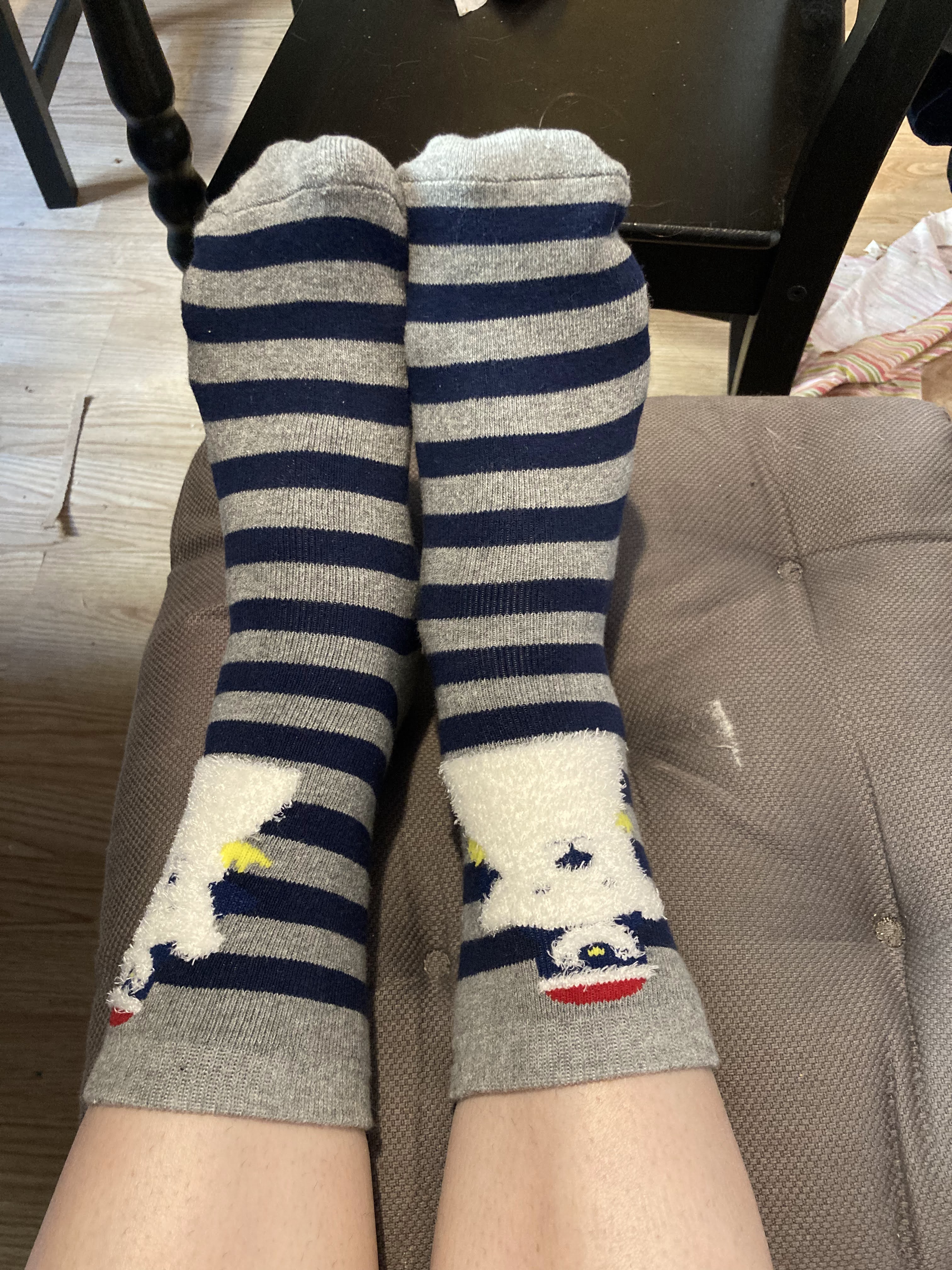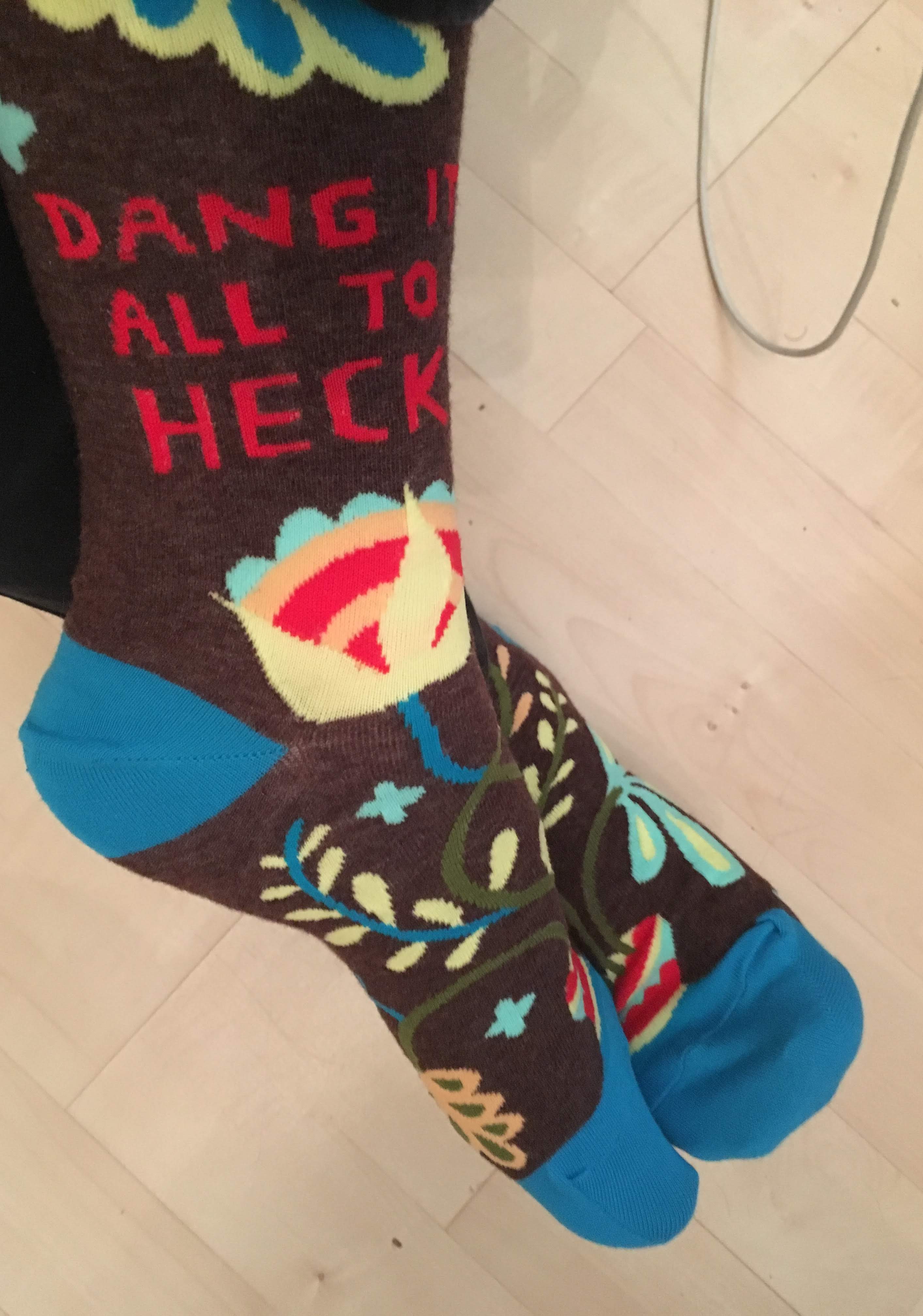 My love affair with socks started early on in my life. I didn’t really like tights when I was younger, and after an 18-month mission in Sal Lake City and Southern California I especially hated tights. Then suddenly fun colored tights in my size appeared on the market, and I started to wear skirts with fun tights as well, but my love remained fun socks. Socks are made even more fun when they enter the black hole that spits them out as a containerless Tupperware lid in a parallel universe, so I end up with all these awesome, single socks. I like to wear them mis-matched just to be able to continue wearing them.