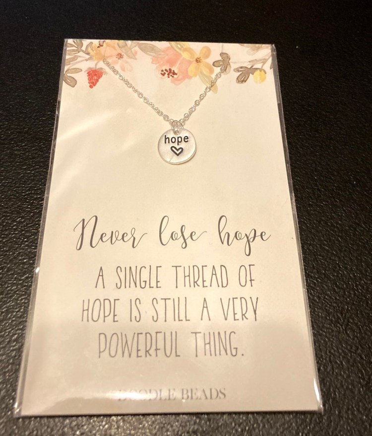 For quite a while I was too afraid to wear this beautiful necklace, not to mention that my neck was (still is) too thick to wear the original chain. I kept it in my scriptures, trying to draw strength from it. It was a difficult time, grieving my mom, and being about ten days away from starting a new job that I wasn’t sure was really for me (thank you, F.Z. and the others for helping me learn new things!) and I was struggling with depression and anxiety. I had anything but hope. Every day my goal was to just get through the day, and then try to fall asleep, and just wait for the morning to come. It was a vicious circle. I had so much fear and so little hope, and I was just so lonely in the middle of the second COVID lock down. I was isolated from my church friends, and I had little to no contact with my former colleagues. But in that package there was hope.