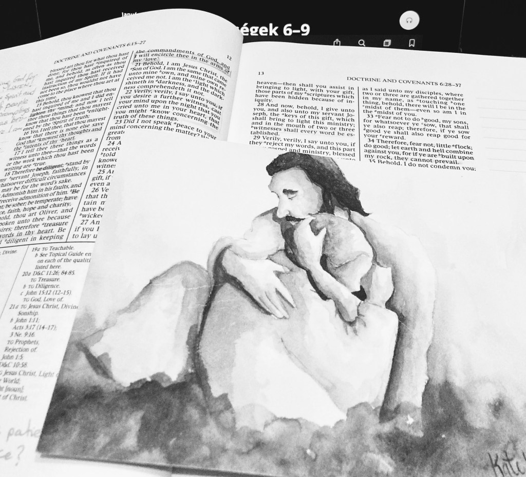 As spring rolled around, I bought a new chain and started to wear my cute little pendant every day. Later on I added another reminder to it to be still. This necklace and three simple silver rings were the jewelry I usually wore, all being reminders that helped me redirect myself in times of high anxiety or hopelessness. Going to the Temple without my necklace gave me a minor panic attack, because it was the aid I could literally hang onto to remind myself what, or rather who the real source of my hope was. A painting by Kate Lee, also included in that package, showed it perfectly.
